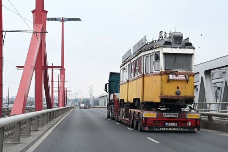 A Magyar Műszaki és Közlekedési Múzeum UV3 típusú villamos motorkocsiját viszik trélerrel a Rákóczi hídon 2022. november 22-én.